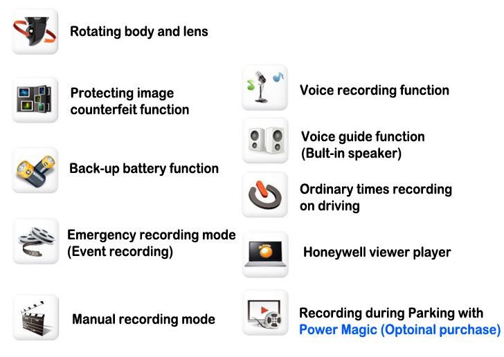 The Honeywell HBB-1100WN is a latest technology of In-Car Black Box designed and made in Korea boasting many vital and unique features such as WDR(Wide Dynamic Range) to defect direct lights, 300K pixels CMOS Camera with a 360 degree rotating lens and a wide viewing angle to a 120 degree, the built-in G-sensor to auto-detect impacts made on the vehicles, GPS tracking etc